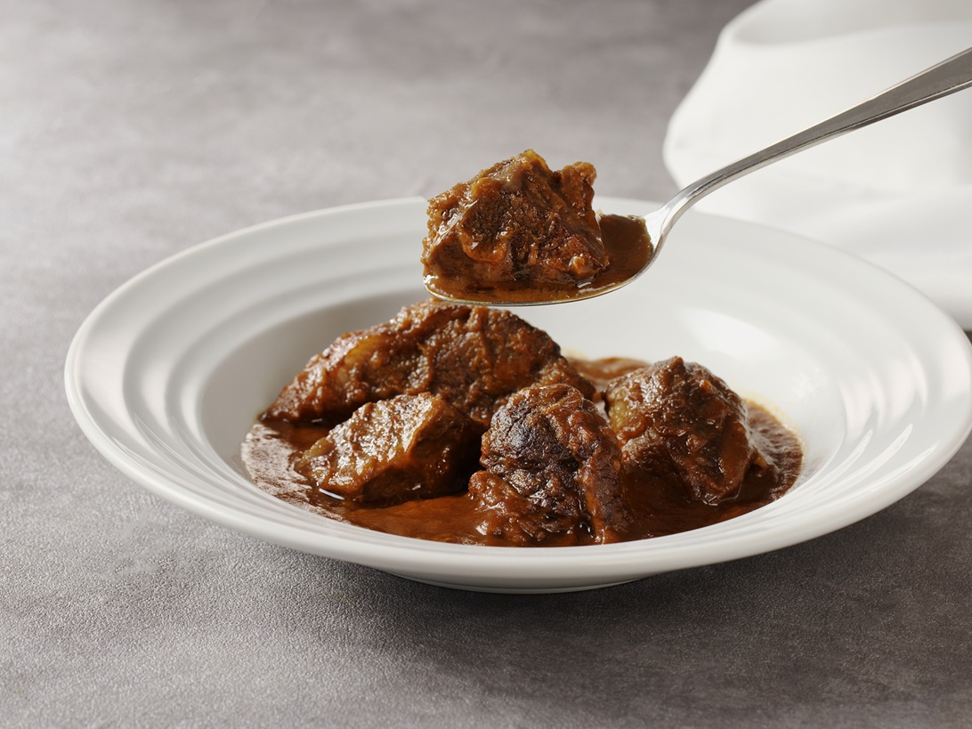 たっぷりの赤ワインと香味野菜でじっくりと丁寧に煮込んでおります。